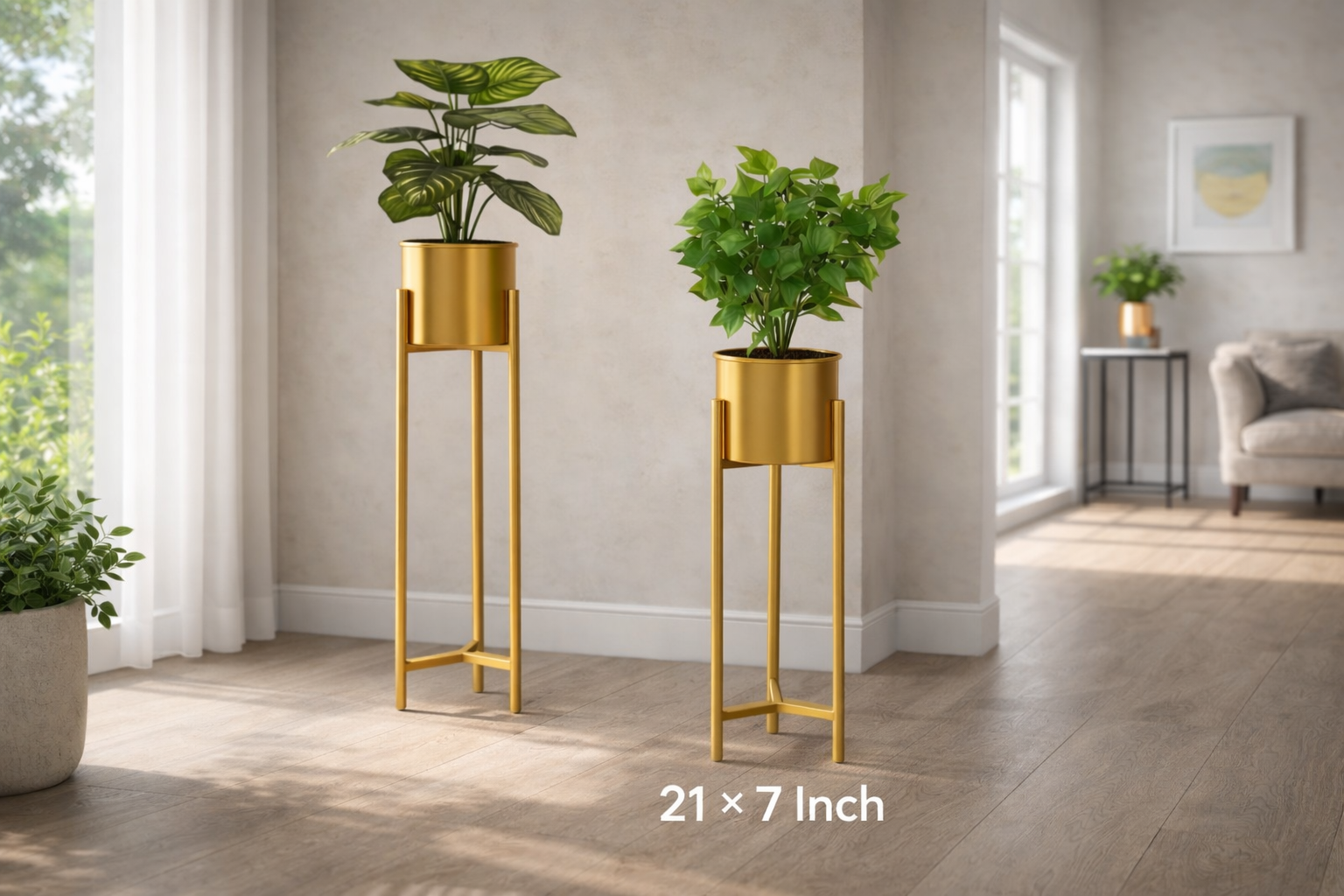Modern gold plant stand with planter, designed to add a stylish and elegant touch to your home décor. Perfect for indoor use, this 21 × 7 inch stand is ideal for living rooms, bedrooms, offices, and corners. Strong, stable, and visually appealing. 🌿